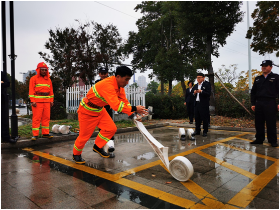 食阁模拟发生火情,紧急开展疏散、救援工作,组织引导商户、员工有序撤离、疏散。消防人员演示灭火器使用,食阁商户人员及食阁工作人员进行现场实操。物管部门进行消防器材展示演练,安保人员开展消防设施安装技能、火灾扑救技能竞赛。