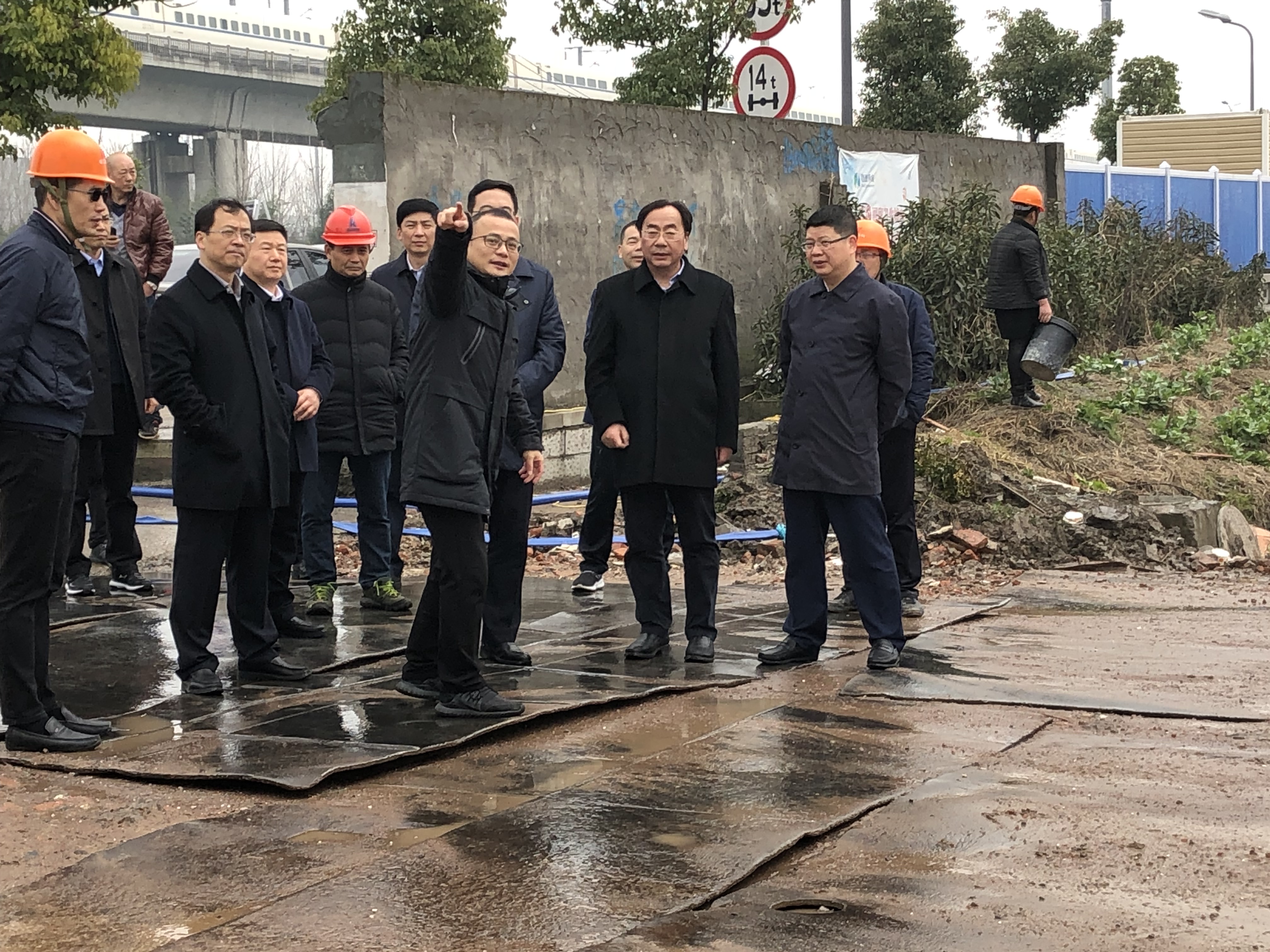 现场施工人员正在忙碌地进行打桩作业,场地内数台挖掘机正在场地平整和土方开挖,建筑渣土运输车辆进出工地络绎不绝,整个工地现场施工显得既井然有序,又热火朝天。马书记和盛市长在现场就项目的建设情况等相关问题进行了询问,建设集团副总经理茹建冬对此作了详细介绍和讲解。马书记和盛市长充分肯定了区委区政府和区建设集团为加快推动项目建设所做的一系列工作,并要求建设各方再接再励,科学组织,精心施工,抢进度、抓质量、保安全,力争2019年9月份1#展厅能率先投入使用。